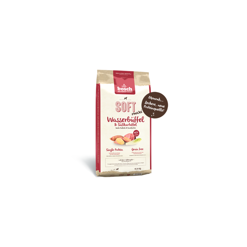 bosch SOFT maxi Wasserbüffel & Süßkartoffel ist ein Single Protein-Produkt für die ausgewogene und gesunde Ernährung ausgewachsener Hunde großer Rassen. bosch SOFT maxi Wasserbüffel & Süßkartoffel ist besonders für ernährungssensible Hunde geeignet, die unter Futterunverträglichkeiten und Allergien leiden.