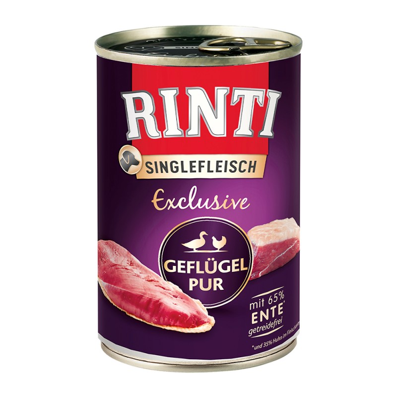 SINGLEFLEISCH EXCLUSIVE - einzigartige Komposition aus Fleisch und Innereien einer besonders exklusiven Tierart Rinti Singlefleisch Exclusive bietet eine ausgewogene Ernährung für Hunde mit besonderen Ansprüchen, ohne Kohlenhydrate und getreidefrei, mit nur einer Proteinquelle. Die verwendeten exklusiven Tierarten sind ideal für Hunde, die auf häufiger verwendete Tierarten allergisch reagieren könnten. - für empfindliche / wählerische Hunde. Alleinfuttermittel für ausgewachsene Hunde Rinti Singlefleisch ausschließlich mit 100% Geflügel Pur (65% Ente und 35% Huhn im Fleischanteil). Auch für sensible Hunde - bei Futtermittelallergien.
