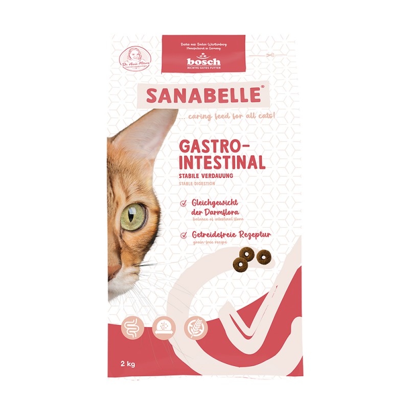Sanabelle Gastrointestinal zeichnet sich durch eine besonders hohe Verdaulichkeit aus und kann durch seine hohe Energiedichte den Magen-Darm-Trakt ernährungssensibler Katzen effektiv entlasten. "Gleichgewicht der Darmflora Präbiotische Fasern wie Inulin aus Chicorée und Pectin aus Apfel, hochwertige Hefen mit Mannanoligosaccariden und Beta-Glucanen, kombiniert mit wertvollen Ballaststoffen aus Psyllium, unterstützen das Gleichgewicht des Darmmikrobioms und können den Verdauungstrakt insgesamt entlasten." "Ohne Zusatz von Getreide Durch die Verwendung von hochverdaulicher Kartoffel und dem bewussten Verzicht auf jegliches Getreide ist die Rezeptur besonders geeignet für ernährungssensible Katzen mit einer Getreideunverträglichkeit. "Extra Lachsöl Der hohe Fettgehalt aus wertvollem Lachsöl und hochwertigem Geflügelfett sorgt für eine besondere Akzeptanz des Futters und unterstützt die optimale Futteraufnahme. " "Hochverdauliche Proteinquellen Der hohe Proteingehalt aus wertvollen Eiweißquellen wie frischem Geflügel und getrocknetem Geflügelprotein sorgen für eine besonders hohe Verdaulichkeit und können damit eine Entlastung des Magen-Darm-Traktes unterstützen."